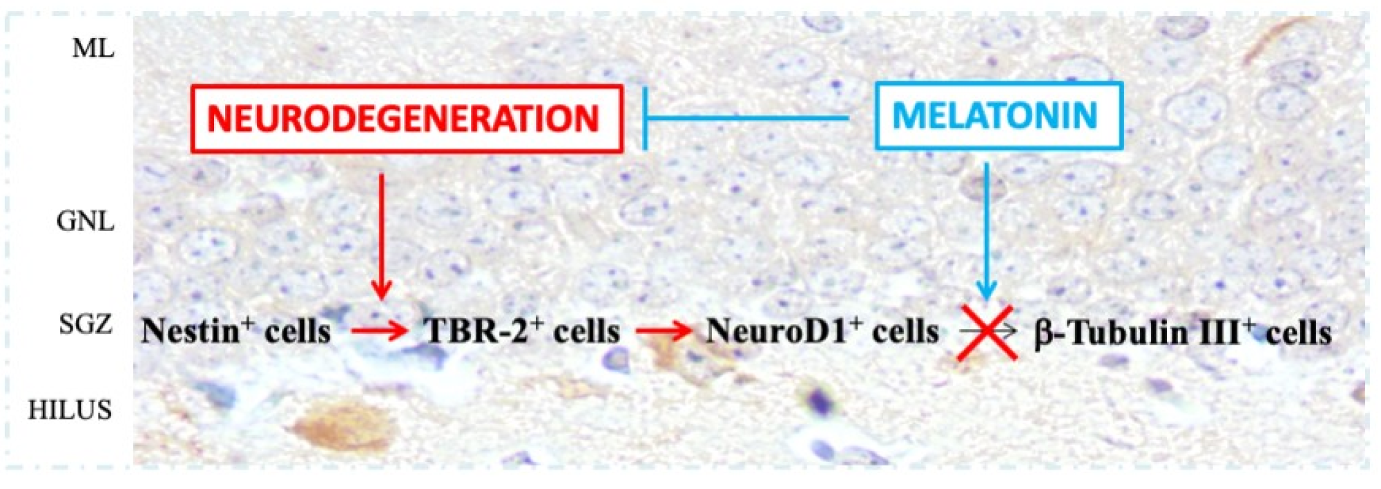 El tratamiento crónico con melatonina durante 9 meses indujo una disminución significativa de los procesos neurogenerativos y de la respuesta neurogénica del hipocampo en estos ratones. Sin embargo, la melatonina parecía promover la supervivencia celular y la restauración de las alteraciones de la migración y/o maduración de las células precursoras neurales observadas en el hipocampo de los ratones control, promoviendo así una neurogénesis hipocampal funcional en los ratones SAMP8 tratados con melatonina. Por lo tanto, corroboramos los beneficios neuroprotectores de los tratamientos crónicos con melatonina para hacer frente a las alteraciones en la capacidad neurogénica del hipocampo adulto inducidas por la neurodegeneración que ocurre en el cerebro durante el envejecimiento